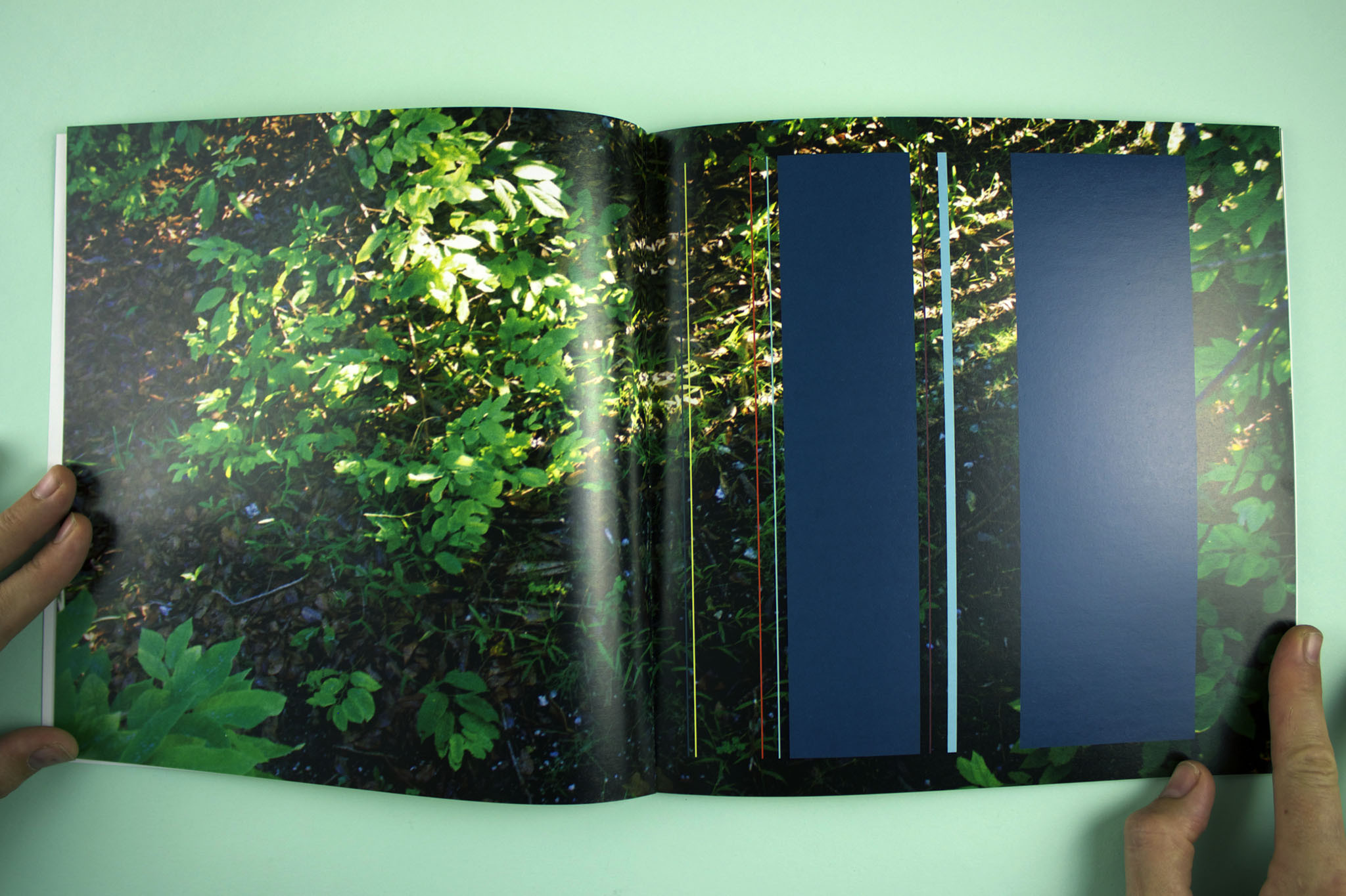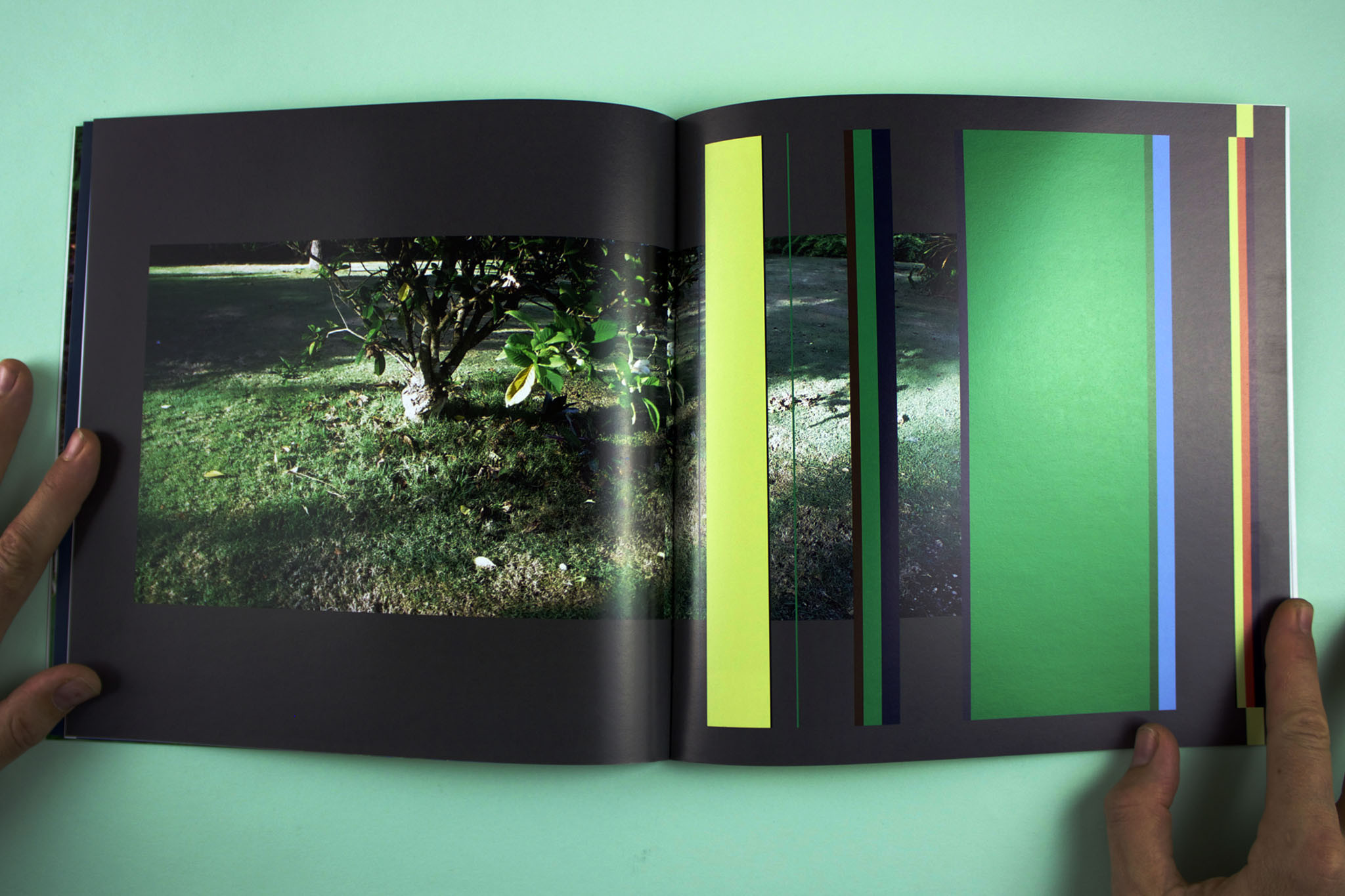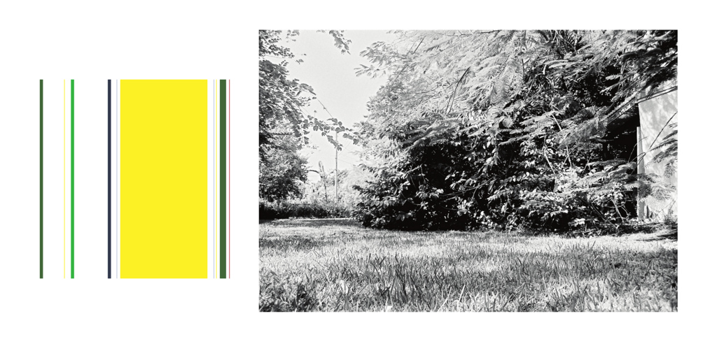 Adler Guerrier’s Scenes from a Verdant Place fuses personal snapshots of tropical backyards and other greens spaces with digitally recovered geometric exercises reminiscent of modernism’s progressive impulses. The strange combination of these two distant worlds generates a tension that not only holds the book together but that reveals the strange hybridizations that happen at geographic and discursive edges and the jerry-rigged conceptual assemblages that often tease potentials from the seemingly-spent forms that have been left behind. Things supposedly expired (geometric abstraction) and things supposedly minor (personal photographs) are twined here into new compositions, which, in their quiet way, pipeline the increasingly-effaced histories of both the Black Atlantic and the modernist project to the surface. And more than this: they pipeline back into the picture the vital translations that major forms undergo in their passage from the Metropolis to the unruly territories of the margins.